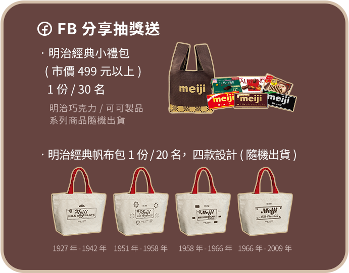 活動期間,參加「吃下meiji祝福連連」互動遊戲活動,依指定時間完成遊戲後,公開分享遊戲結果至FB個人頁面後並填寫抽獎資料,就有機會抽中明治精美好禮!