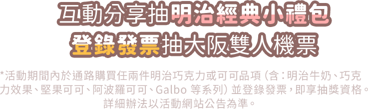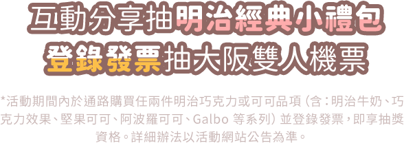 ※限台灣地區開立之統一發票。每張發票僅限登錄一次並取得一次抽獎機會,重複登錄或非明治指定商品發票視為無效。