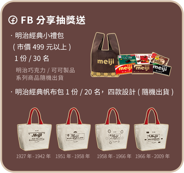 - 活動一中獎者須於2026/02/13(五)前以E-mail回寄中獎人姓名及 Facebook 分享畫面截圖至主辦單位指定信箱(meiji.2025event@gmail.com)供審核,逾期或未寄送者,視同放棄中獎資格。活動二中獎者僅須依通知完成中獎回函及文件寄回程序即可。